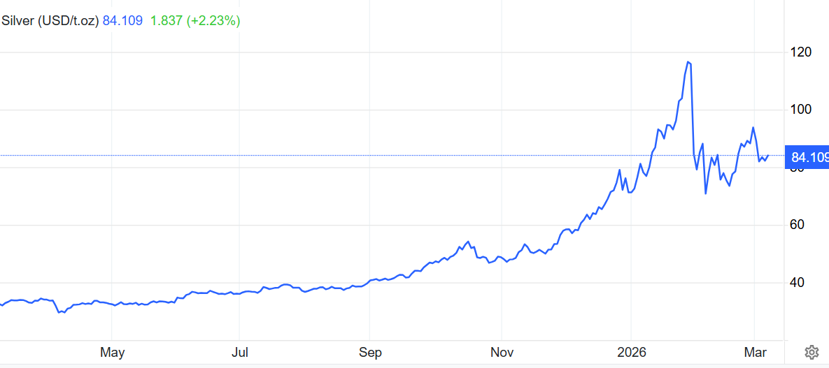 在过去的一年里,虽然经历了自1月底创下的历史最高点位121.678美元以来高达30%的回调幅度,但是白银价值仍然上涨两倍多,大幅超过了最大市值规模贵金属黄金的涨幅,并使黄金与白银之间的比率达到了新的低点——即一盎司黄金等于多少盎司白银的金银比例。相比之下,黄金现货价格在过去一年上涨了约90%。当前现货白银价格徘徊在85美元附近,自2月低点以来大幅反弹近20%。