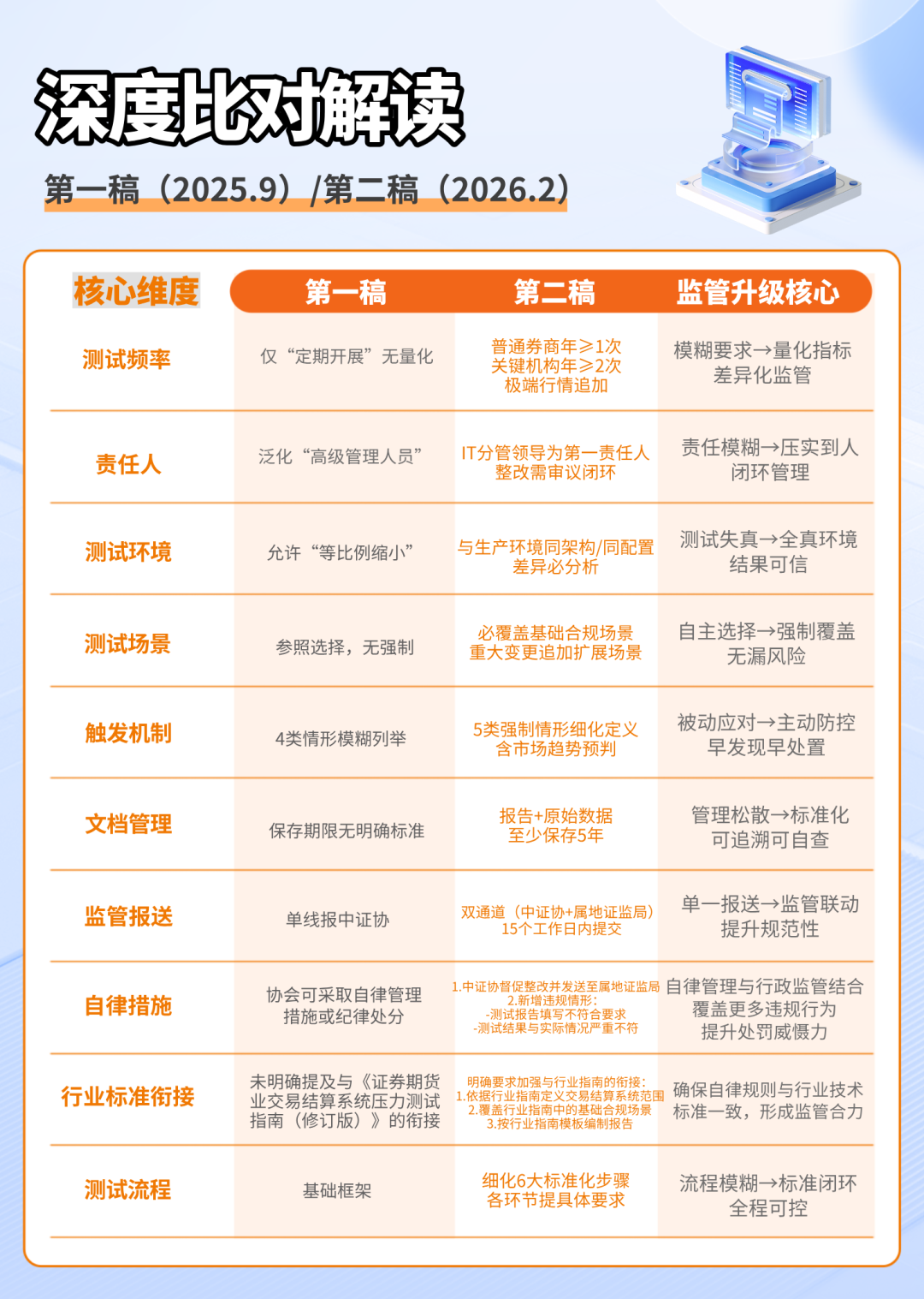 从一稿的“宽松建议”升级为“刚性强制”,10大核心维度要求全面从严,不达标将面临自律处罚+行政监管联动,交易结算系统压测已成为券商合规刚需!